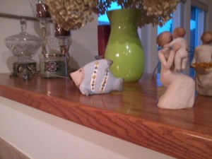 But yesterday when I picked her up she was all smiles. She handed me a small blue pottery fish that she’d won at Bingo. I almost cried from joy. The Bingo Fish now lives on my fireplace mantle next to several wooden angels friends have given me. I doubt it’ll ever be moved. I could just as well call it the Angel Fish for all the joy I feel each time I see it.