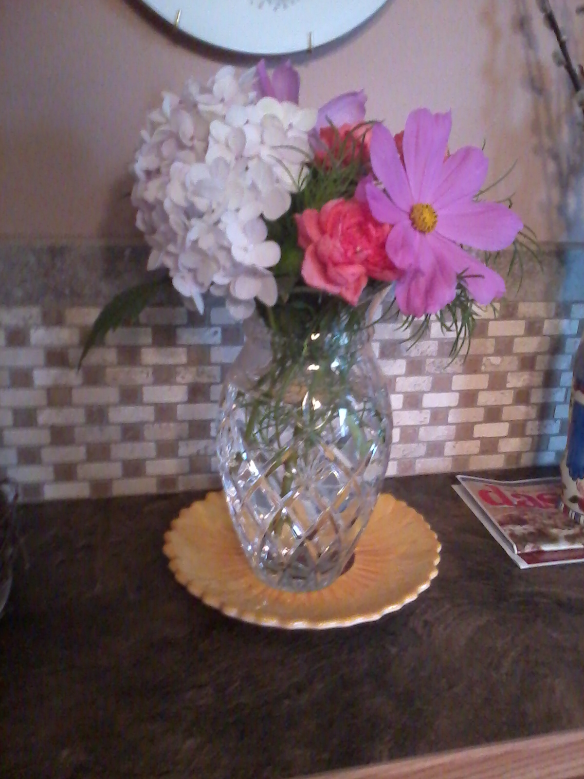 But me? I’m thinking about the last of the summer flowers, like good friends to me all summer long, keeping me company out on the patio while I had a nice glass of wine and read a book so many afternoons. I’m reflecting on this vase I love, given to me long ago by an employer, and the sunflower plate underneath this vase, from my long-time friend, Gail, in CA. And of course I am enthralled by the beauty of the flowers.