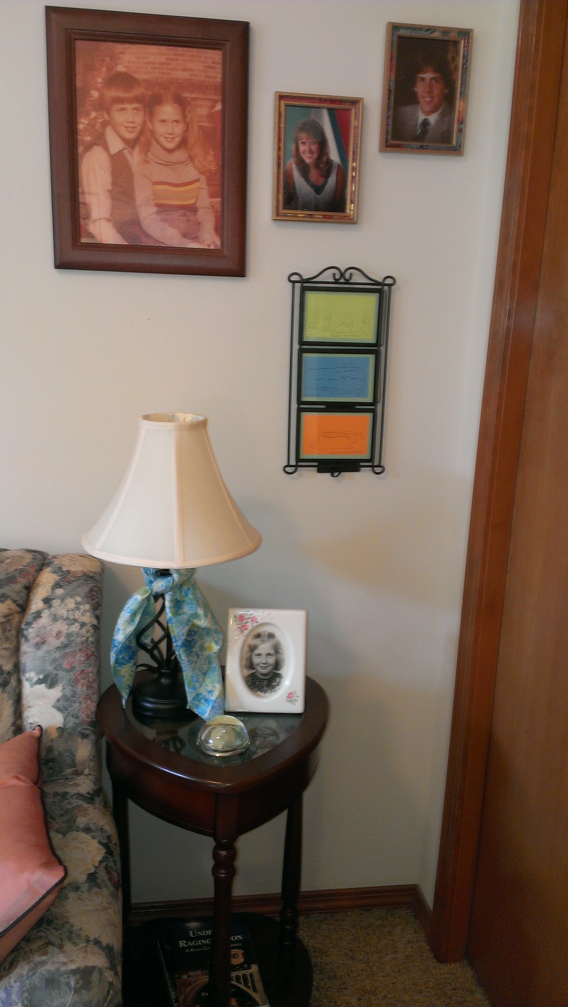 There’s a small lamp beside my photo, reminding me to look to the light, and a sweet Joan Walsh Anglund paperweight from my friend, Gail, in Riverside, CA. She gave this to me years ago. It pictures two little girls with bows in their hair, each holding a doll, & has ‘Friendship’ written at the top. Another treasure. It reminds me to keep friends close.